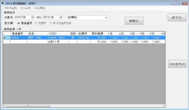 日医標準レセプトソフトORCAのデータで、室料差額対象の患者を検索して、集計するシステムです。